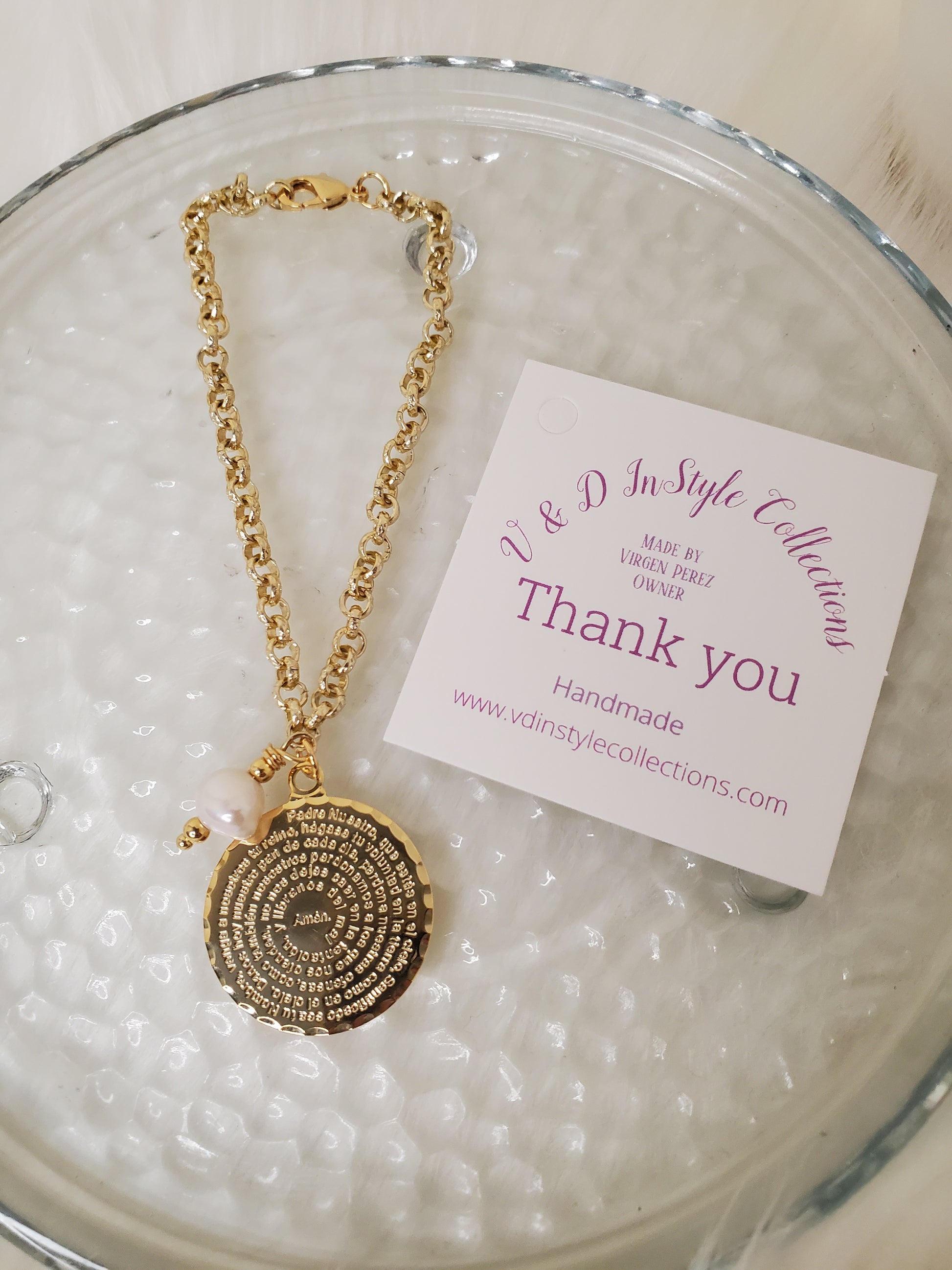 material: 18k gold plated chain and bracelet-our father prayer charm in spanish water pearl-and faith charm.