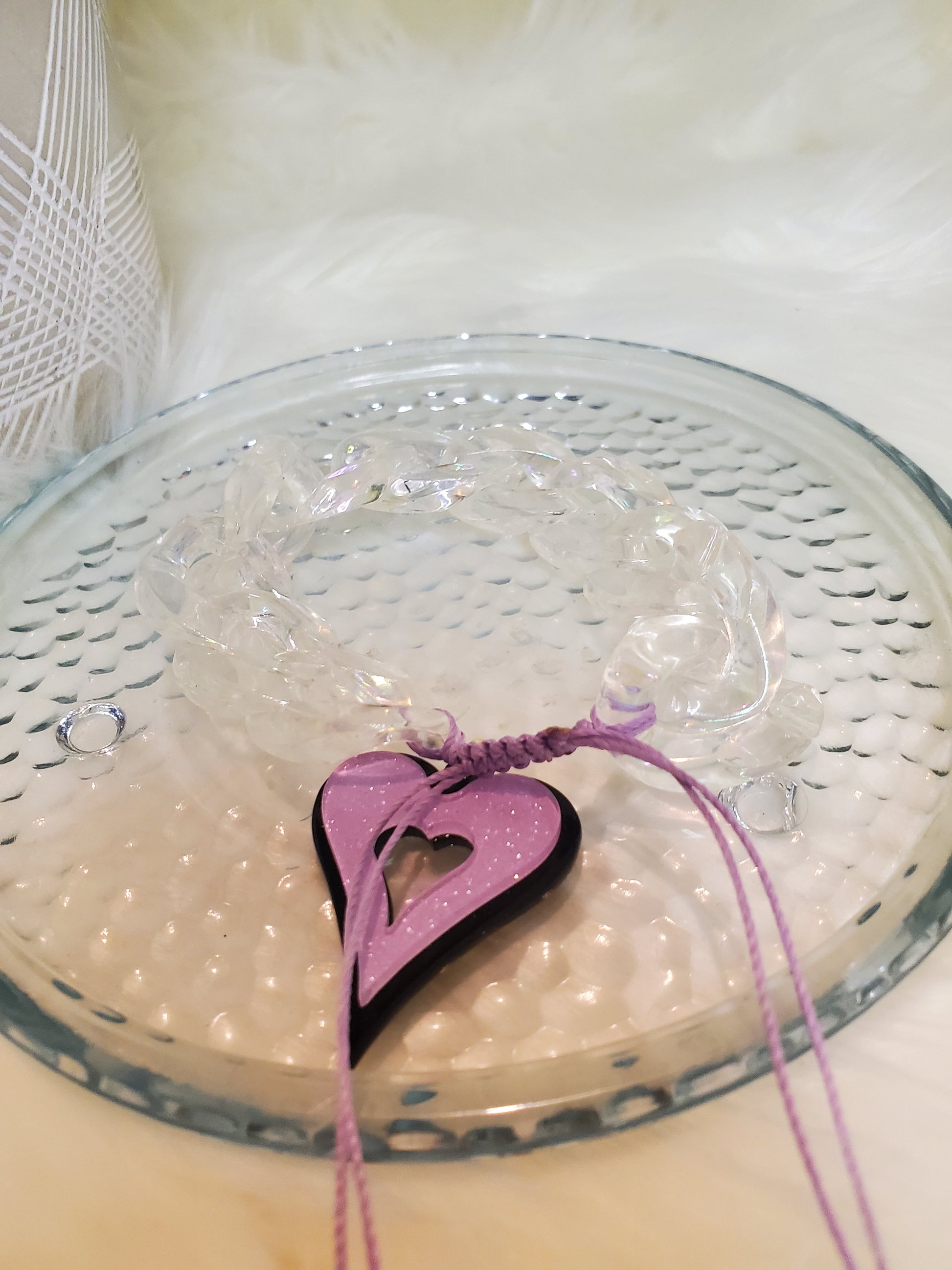 Material: acrylic links, silicone charm and waxed cotton cord.