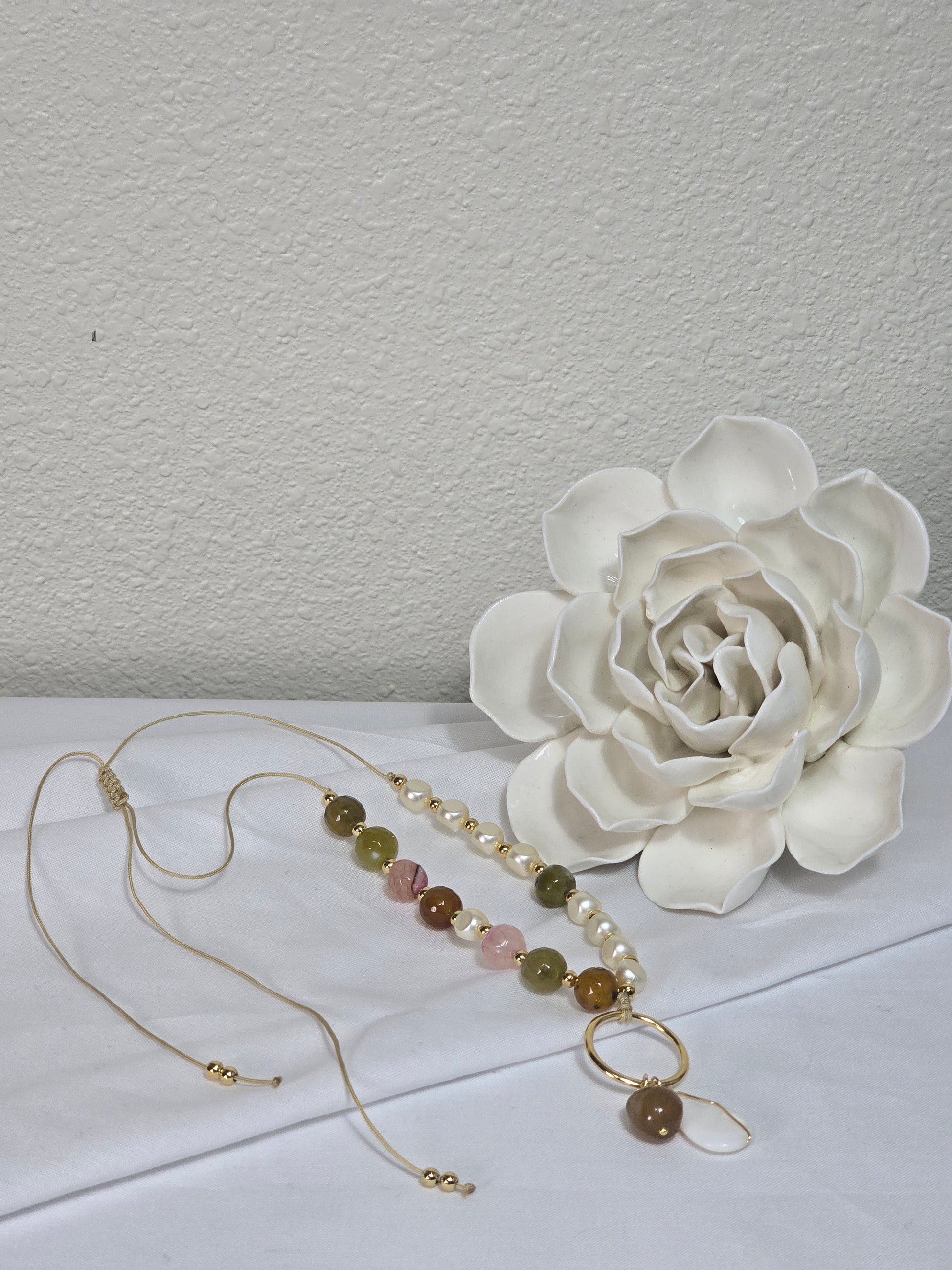 Material: gold plated, nylon string, water pearl, jasper beads.