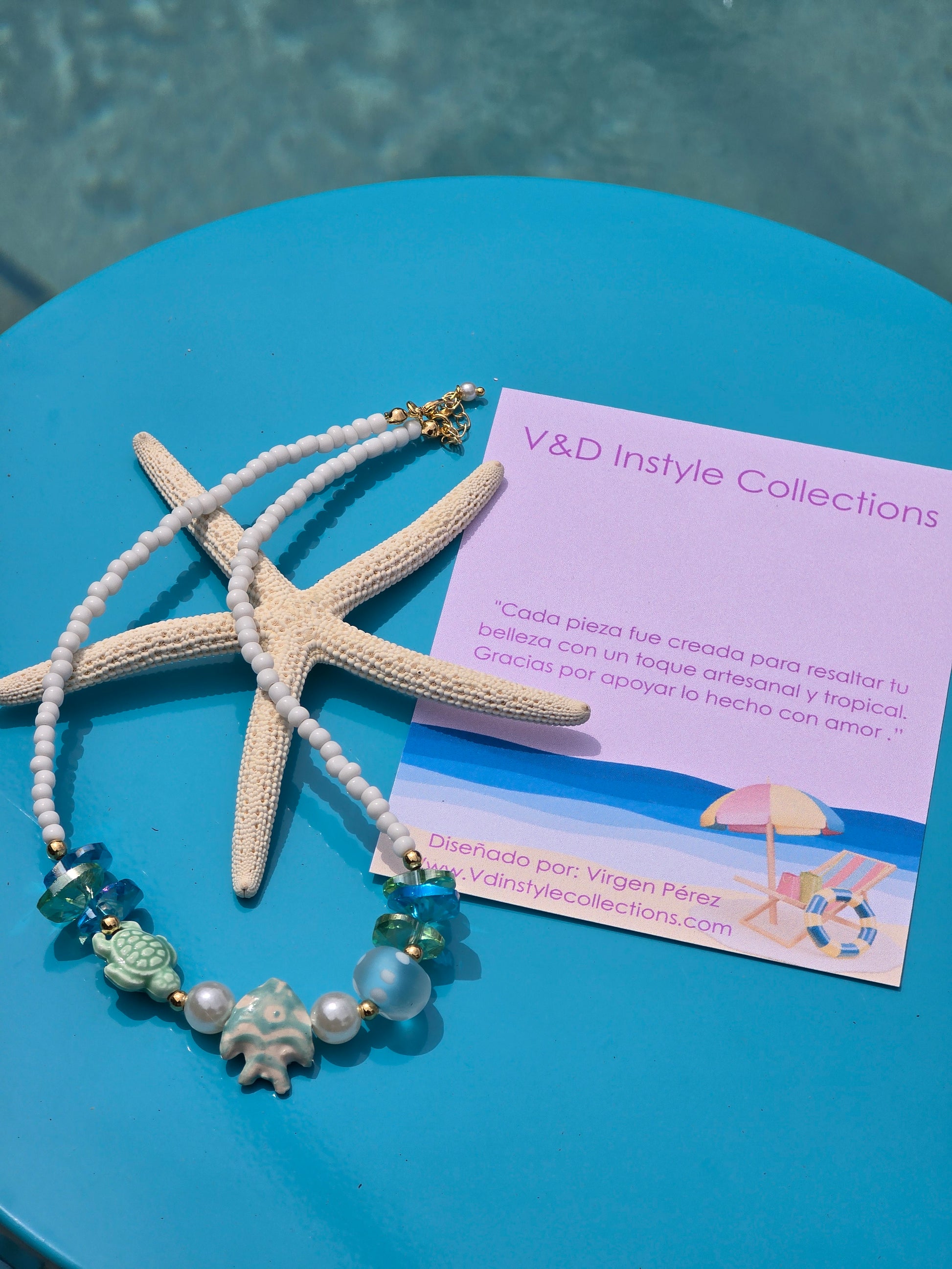 Style: bring the beach with you wherever you go. this handmade necklace features a beautiful blend of natural shells, colorful beads and delicate pearls, perfect for adding style to your summer look.