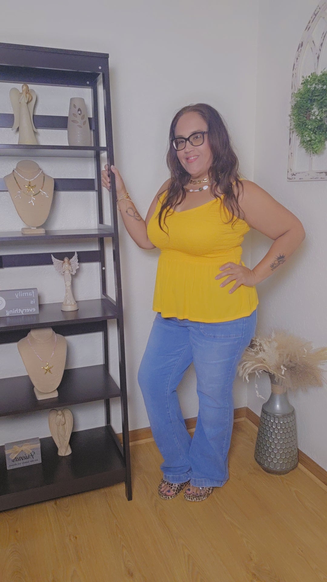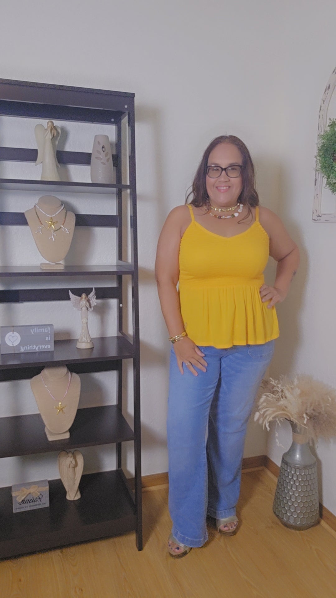 Style: spaghetti strap top with elastic around the top very comfty and well fit.