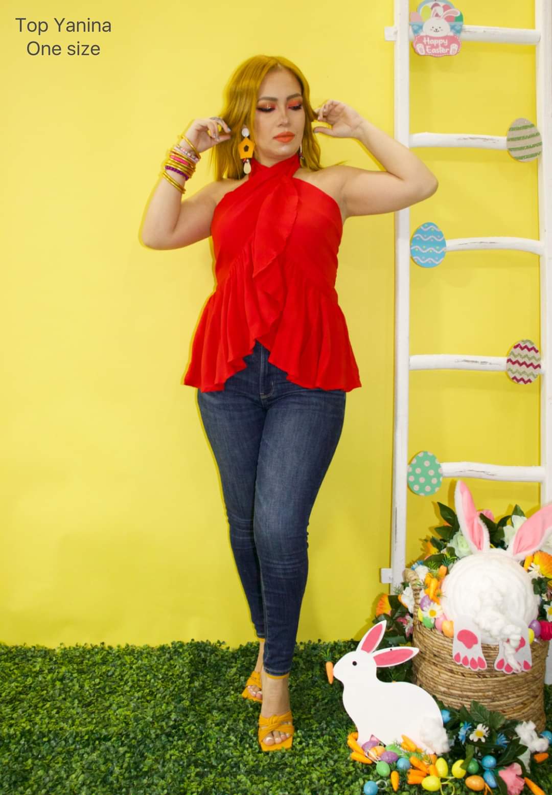 Style: sleeveless--tie around the neck-ruffle in the front.