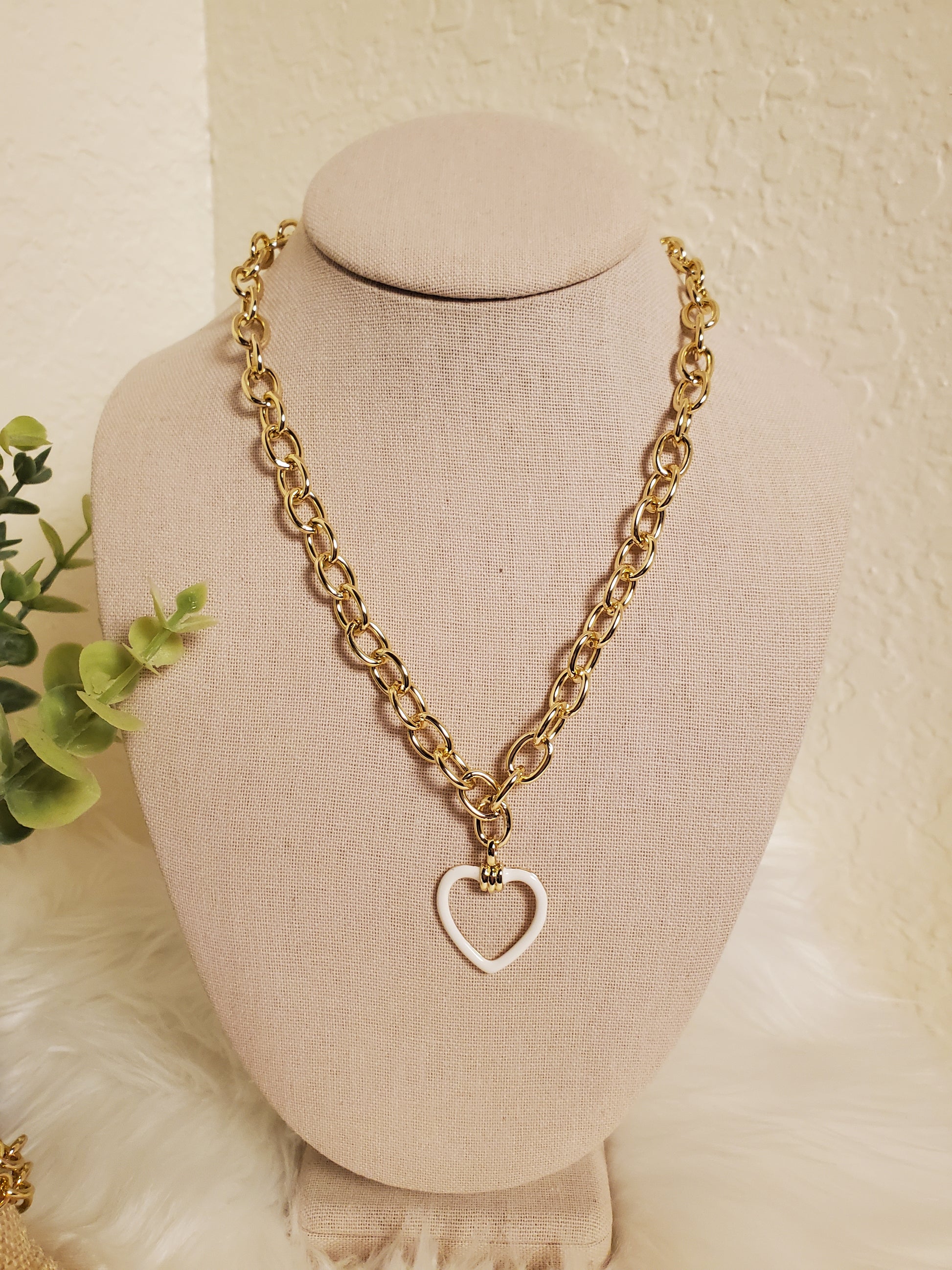 material: gold plated 18k heart, aluminum chain and white enamel heart.